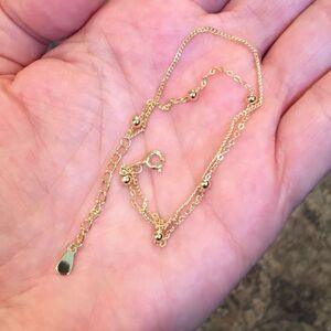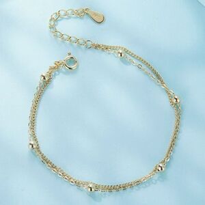 Yellow Gold Electroplated 925 Sterling Silver Beaded Double Layer Chain 7.5in Bracelet The bracelet measures 6 inches and has a 1.5 inch extension chain. The tag is stamped S925 and the clasp is stamped 925 (the spring inside is not silver, but the outer casing of the clasp is gold plated sterling). It weighs about 1.7 grams. The dainty, classic, chains each measure about 1mm wide and the beads are about 3mm wide.