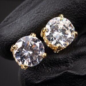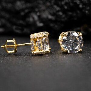 Classic Fully Iced Cz Round Solitaire Men Women Yellow Gold Plated 925 Sterling Silver Stud Earrings Screw Back Stud Circle Earrings 9 Millimeters Unisex Nickel Free Small Earring Studs.