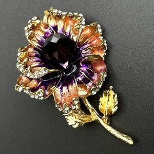 Yellow Gold Tone with Coral and Royal Purple Enamel Single Stemmed Flower Pin Back Brooch Embellished with Purple Amethyst and White Diamond Crystals