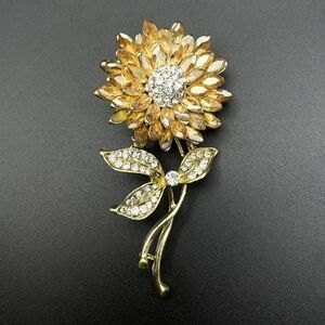 Yellow Gold Tone Stemmed Sun Flower Pin Back Brooch Embellished with Champagne Topaz and White Diamond Crystals