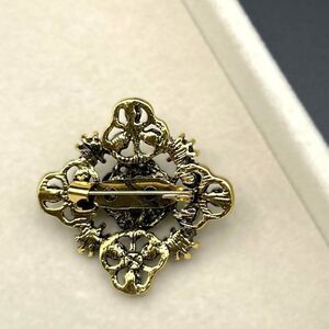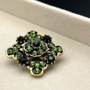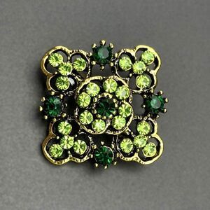 Antique Yellow Gold Tone Vintage Style Ornate Pin Back Brooch Embellished with Emerald and Peridot Green Crystals