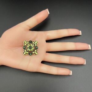 Yellow Gold with Emerald and Peridot Green Crystal Ornate Pin Back Brooch