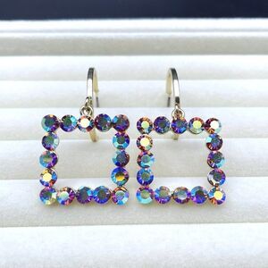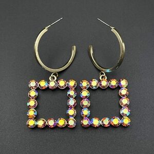 Yellow Gold with Iridescent AB Crystal Dangling Square and Hoop Post Earrings