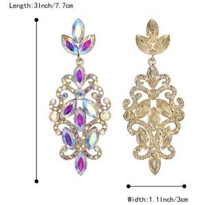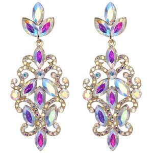 Yellow Gold Tone Marquise Leaf FIligree Dangling Drop Post Back Chandelier Statement Earrings Embellished with Iridescent AB (Aurora Borealis) Crystals