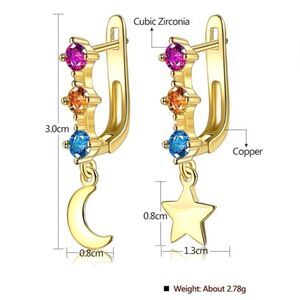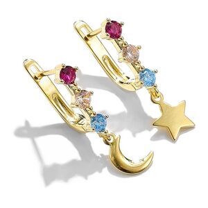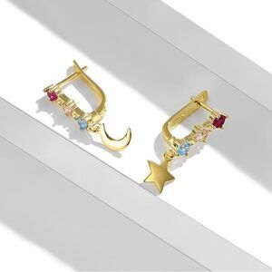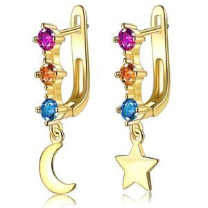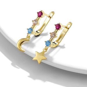 Yellow Gold with Multicolor Cubic Zirconia Moon and Star French Clip Earrings