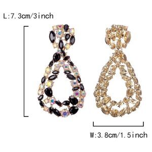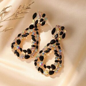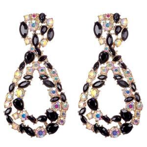 Yellow Gold Tone Open Teardrop Geometric Dangling Drop Post Back Statement Earrings Embellished with Teardrop, Marquise and Round Cut Black Onyx and Iridescent AB (Aurora Borealis) Crystals