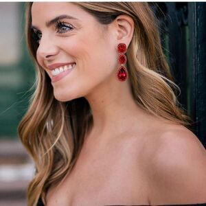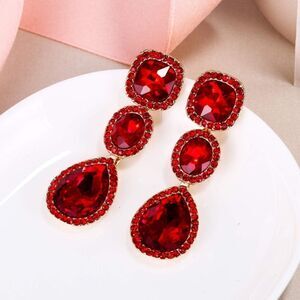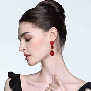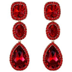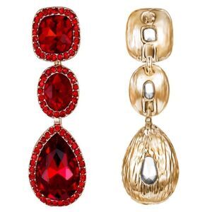 Yellow Gold Tone Dangling Drop Post Back Chandelier Statement Earrings Embellished with Square, Oval, Teardrop and Round Cut Ruby Red Austrian Crystals