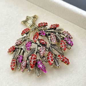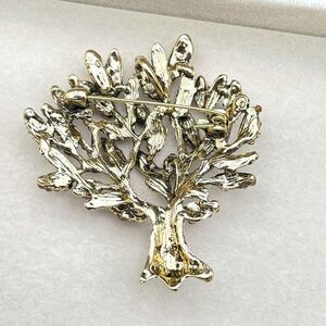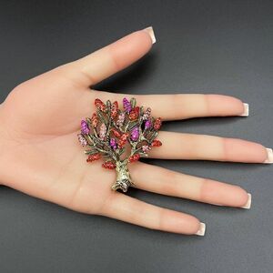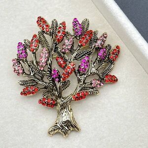 Yellow Gold Tone Blooming Tree Pin Back Brooch Embellished with Ruby Red, Fuchsia and Pink Sapphire Crystals