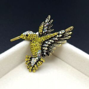 Yellow Gold with Yellow Citrine and White AB Crystal Hummingbird Pin Back Brooch