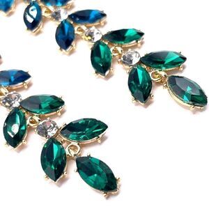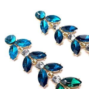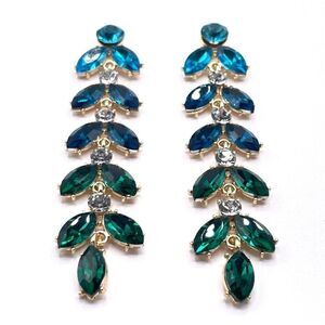 BRAND NEW - Long Dangling Yellow Gold with Blue, Green and White Crystal Ombre Leaves Post Back Earrings