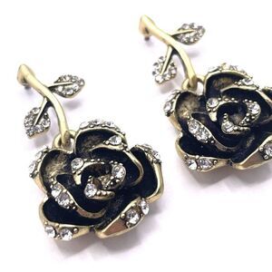 Yellow Gold with Black Oil Drip and Crystal Roses Flower Post Back Earrings