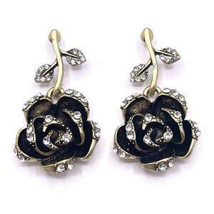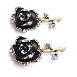 BRAND NEW - Yellow Gold with Black Oil Drip Enamel Dangling Stemmed Rose Flowers Post Back Earrings Embellished with White Crystals