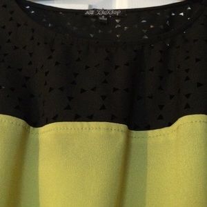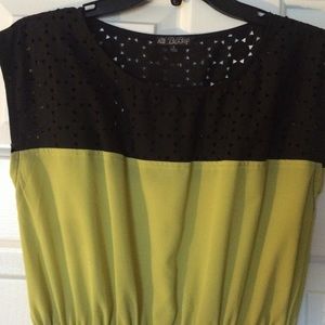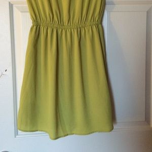 This dress is so beautiful. It's color is unique, it is sort of a yellowy green color and has a black print out at the top. I have worn this twice and it is perfect for a wedding or just a get together with some friends! Still looks completely brand new!