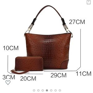 Yellow/Mustard Wandy handbag with matching wallet set. Vegan leather, faux alligator. Gold hardware. Second photo in cognac is to show measurements only, color is mustard yellow.