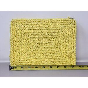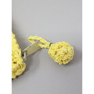 This clutch bag combines functionality with style, featuring a handwoven crochet design in a vibrant yellow shade. It offers secure storage with a zipper closure and a playful pom-pom accent.