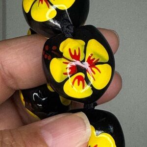 DESIGN: hand-painted yellow with red center hibiscus. Because these are hand painted and hand strung, and the nuts may vary in size, the design will not be exactly the same from nut to nut.