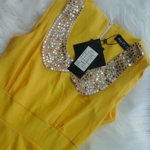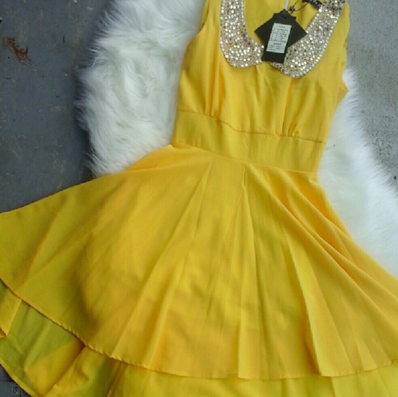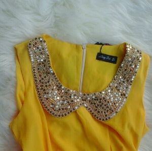 Sleeveless Peter Pan Collar With Sequins Irregular Hem Tiny Dress Yellow