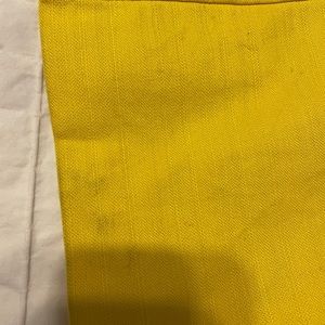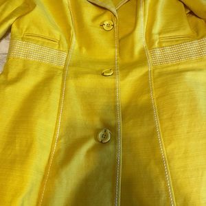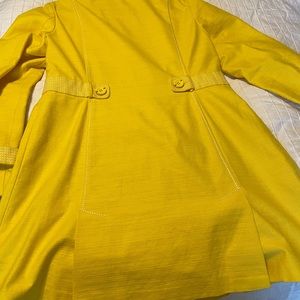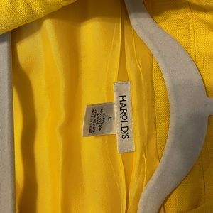 This is a beautiful bright sunny yellow king blazer jacket. Fabric is cotton light, not wool or wintry. Beautiful buttons. Hard to find color and style. This a very good quality from Harolds. Size Large.