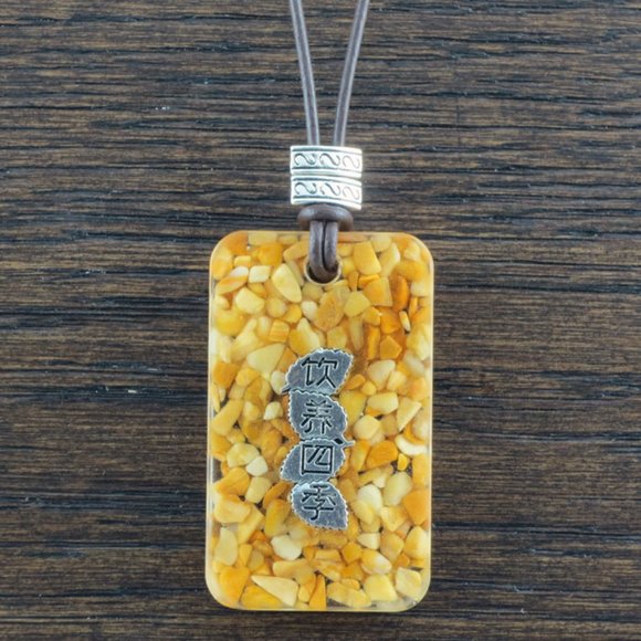 This unique Suspension Pendant features natural Yellow Jasper stones, suspended in Jewelry Grade Resin, under a Tibetan Silver Charm. This Pendant comes on a 24″ Brown Leather Cord, that has a lobster clasp closure.