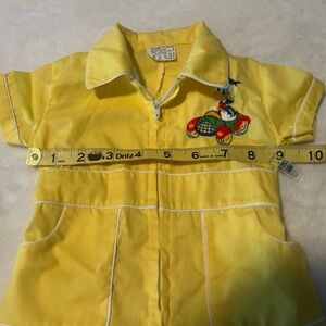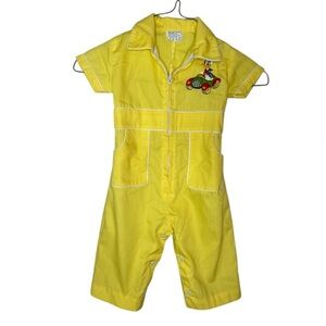 Brighten up your child's wardrobe with this vintage vibrant yellow jumpsuit. Featuring a playful embroidered design, it's perfect for any occasion. Comfortable and stylish, this piece is a must-have for your little one. Size tag is missing but measures 6-9 months