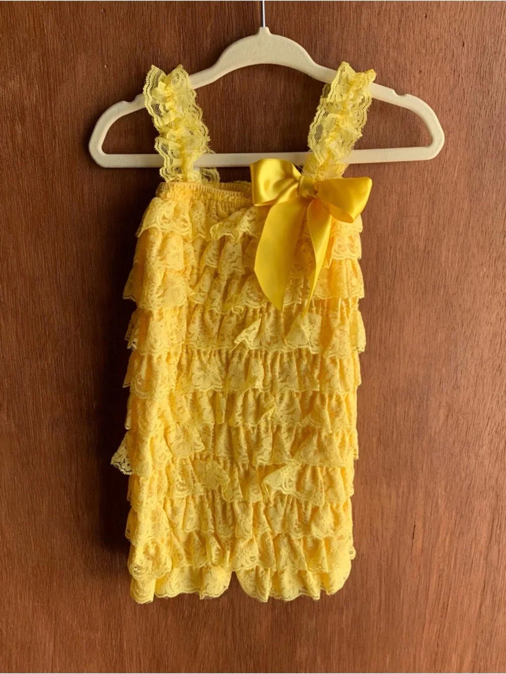 Bright yellow lace romper with layered ruffles with lace straps. Decorative satin bow at the shoulder.