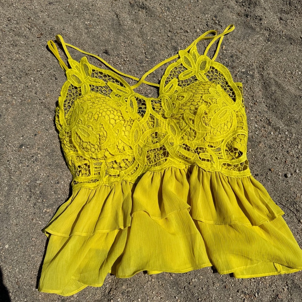 Brighten your wardrobe with this stunning yellow lace ruffle top. Perfect for any occasion, it combines elegance with a vibrant touch.