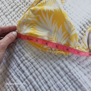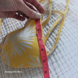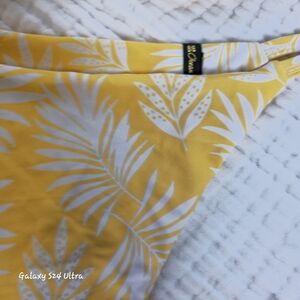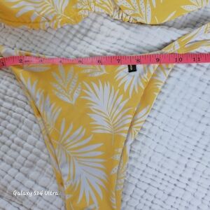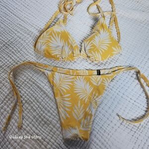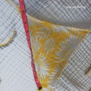 Get ready for summer with this vibrant yellow string bikini featuring a chic white palm leaf print. This two-piece set is perfect for hitting the beach or lounging by the pool on your next tropical vacation. The triangle top has adjustable halter and back ties for a custom, flattering fit, and includes removable pads. The matching cheeky Brazilian-cut bottoms also feature adjustable side ties, allowing you to show off your curves and minimize tan lines.