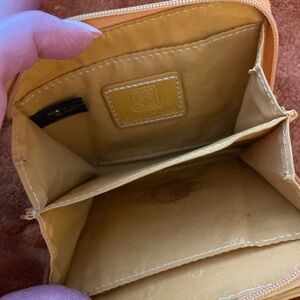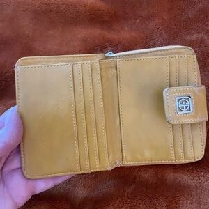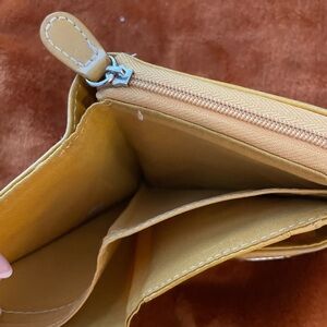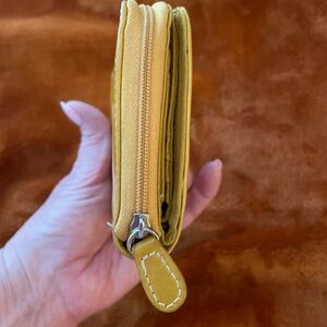 Stylish yellow leather wallet featuring a GD logo. Compact and elegant design.