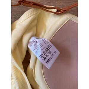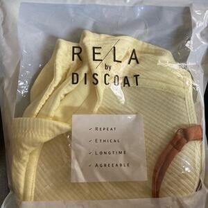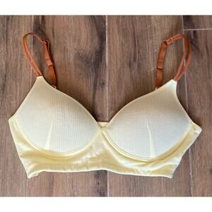 This is a beautiful wireless bra by RE/LA by Discoat. Size Medium. Has some minimal padding for uplift and shape. Is a beautiful soft yellow with brown adjustable straps. This is not an American sized garment but does look like it will fit a medium. New in bag. Smoke free home. See pictures. Offers and questions are welcome!