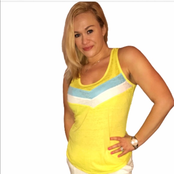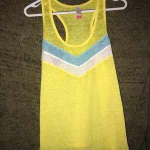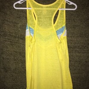Yellow No boundaries racerback tank. Wore one time. Super light to wear, but is a little semi translucent but could be paired with an under tank. Blue and white stripe across the front. Large, true to size.