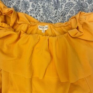 Bright yellow off-shoulder romper with a ruffle neckline and a decorative belt ring. Soft, lightweight fabric for comfortable wear. Stylish yellow color creates a bold, sunny look.