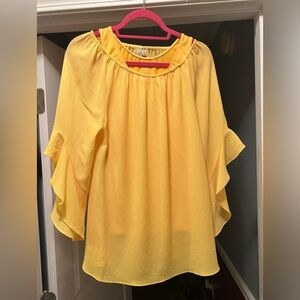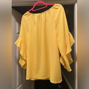 Brighten your wardrobe with this vibrant yellow off-shoulder top. Featuring stylish ruffle sleeves, it's perfect for a chic, casual look. Matching tank top to wear under the blouse or alone. Selling together.