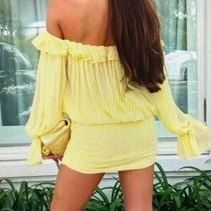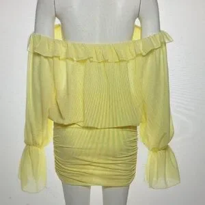 Sunny yellow off-shoulder blouse with ruffle neckline. Matching yellow ruched mini skirt. Coordinating quilted yellow shoulder bag with chain strap. Lightweight, flirty summer look.