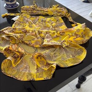 Vibrant yellow two-piece set with paisley print. Includes a crop top and skirt. Perfect for summer outings.