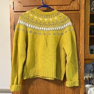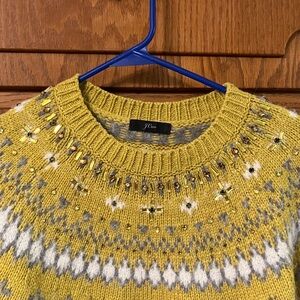 J. Crew Embellished Sweater. Lightly worn. Mustard yellow. No size tag, estimated size large. Not quite cropped on most but hits at hip on petite frame.
