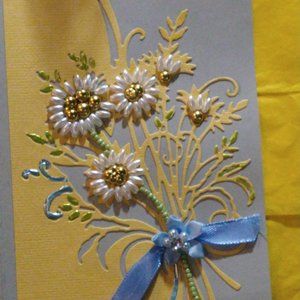 Yellow Pearl Daisy w lt bleu ribbon/Jewelled Sentiments