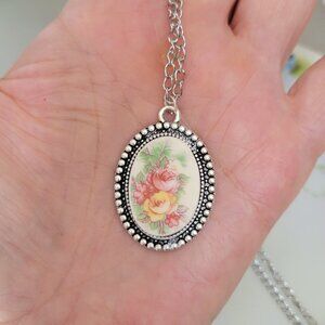 Vintage broken china from a beautiful porcelain saucer with yellow and pink roses on a white background. I hand cut, polished and set it into this lovely metal bezel which measures 1.5" long by one inch wide. It comes on an 18" stainless steel chain with lobster claw clasp. One of a kind, handmade. Would make a great gift! I am passionate about vintage china and never use perfect pieces, but always ones with chips or cracks or otherwise unusable.