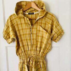 Yellow Plaid Hooded Romper Summer Women’s Small. 3 Pockets, Lined shorts, front Zipper, Drawstring waist, like new condition.