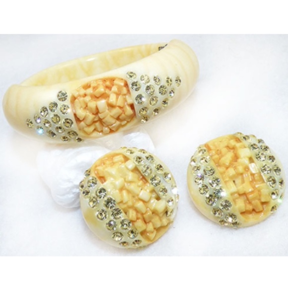 Vintage yellow thermoplastic clamper bracelet and matching clip earrings set; the plastic is a variegated yellow. The hinged clamper has small yellow plastic chips in the center of space that has been carved out, the chips held in place with a deeper yellow resin and then flanked by yellow rhinestones arranged in triangles on either side. The round, domed earrings match the design with a strip pf the chips down the middle and two rows of yellow rhinestones on either side. Weiss style, unsigned.