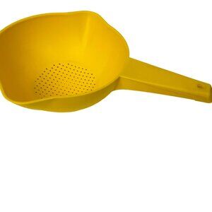 This yellow plastic colander with a handle is ideal for straining pasta, rinsing vegetables, or draining canned goods. Its ergonomic design ensures a comfortable grip.
