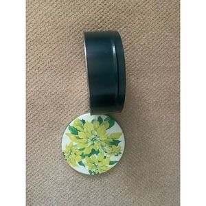 Judy Hand Creative Connections yellow poinsettia cookie tin ... signed on side of lid. Base of tin is dark green. Great vintage piece and unique as most tins have red flowers. Great item to put cookies in and store or gift. Measures 8 inches in diameter and stands 3 inches tall. Very good condition -- typical wear and tear, see photos or ask questions.