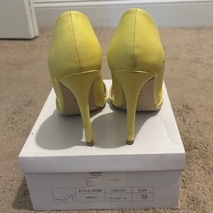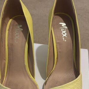 Stylish women's high heels in a bright yellow hue. Pointed toe and textured upper add modern detail. Comfortable insole and sleek silhouette for dressy occasions. A bold yellow option to elevate your outfit. Size 7.5 by Mixx