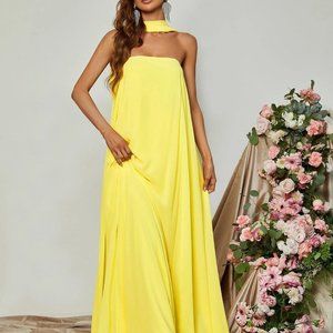 Yellow Preppy Womens Choker Neck Backless Maxi Formal Dress