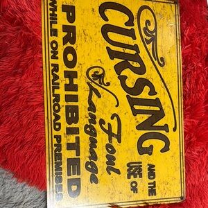This 12x18-inch metal sign humorously reminds viewers of old railroad etiquette, stating, “Cursing and the Use of Foul Language Prohibited While on Railroad Premises.” Its vintage design and playful message make it a charming addition to any space.