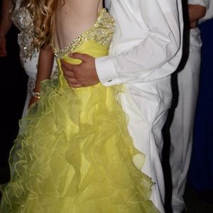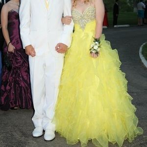 Taken in a little in the chest area, zip up back. I wear size 0-4 jeans and I am 5'3" and wore 3 inch heels. In good condition.