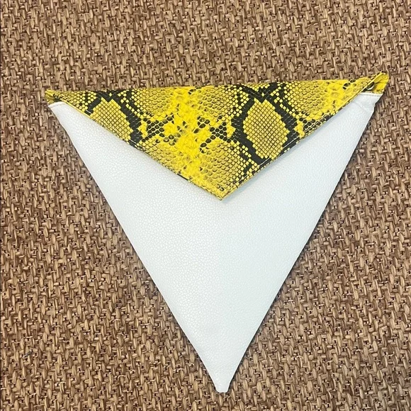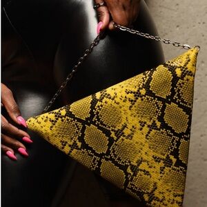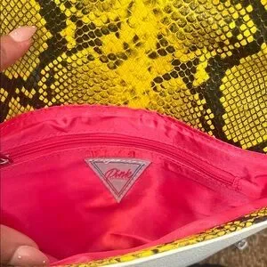 Bold and stylish envelope clutch. Features a striking yellow snakeskin-print flap with a white faux leather body and hot pink interior lining. Perfect statement piece for nights out, festivals, or adding a pop of color to any outfit.