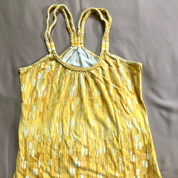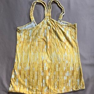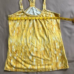 Fun, Lightweight Yellow Racerback Tank Top with braided straps; cute short-line value scale pattern of yellows and white.