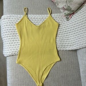 Bright yellow bodysuit with ribbed texture. Clinched waist and ribbed texture gives a flattering fit. Has two super tiny spots on it that you can barely see as shown in pictures and video. Price reflects damage :)