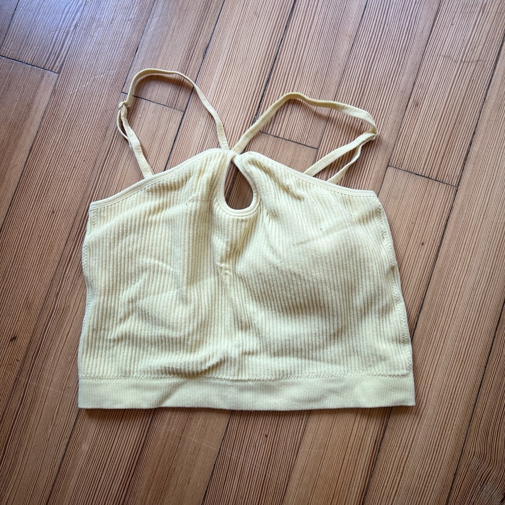 Stylish yellow ribbed crop top with a keyhole design and thin straps.