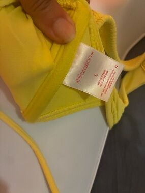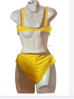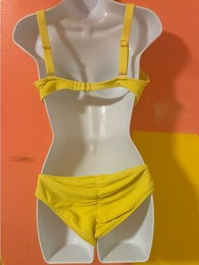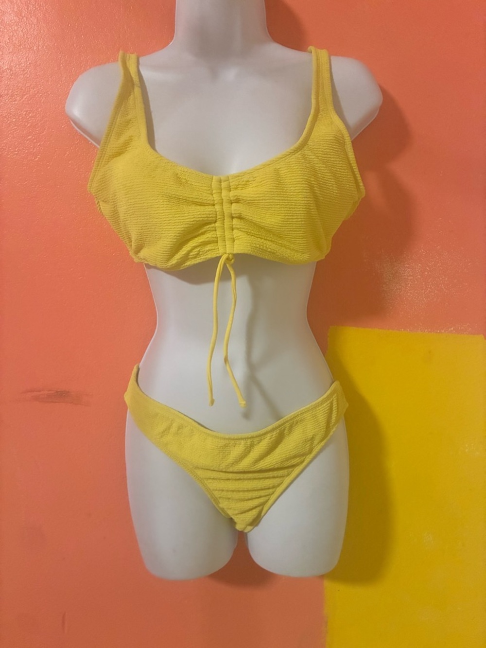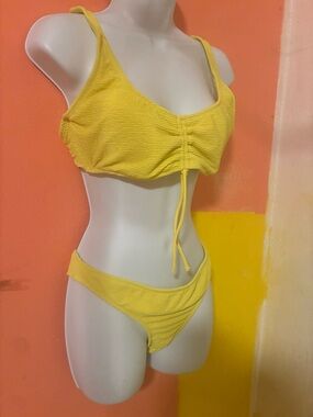 “Bright yellow textured bikini set 💛 Features a ruched front top with adjustable drawstring detail and thick supportive straps. Paired with matching high-cut bottoms for a flattering, cheeky fit. Soft, stretchy fabric that hugs the body comfortably.